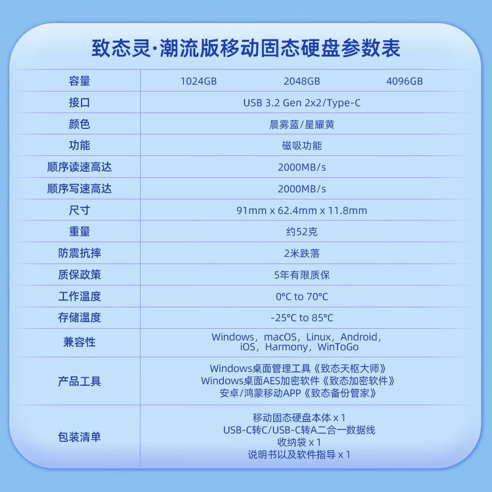 该产品具备 2 米抗跌落能力,提供 5 年有限质保,容量可选 1TB、2TB 和 4TB 三种版本,售价分别是 959 元 / 1459 元 / 2649 元。