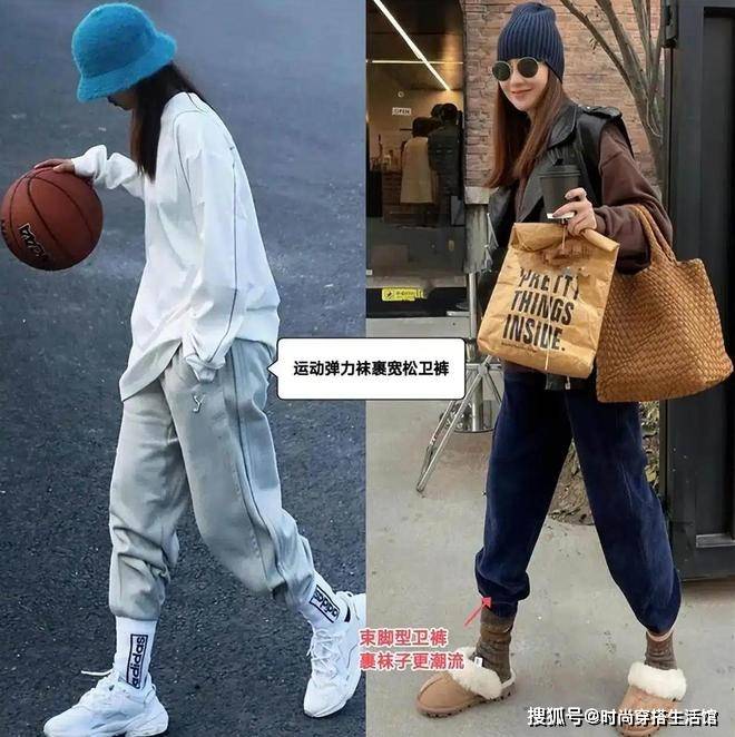在“袜子裹裤子”的潮流影响下,今年还火了运动袜裹卫裤的穿法。新手选择束脚型卫裤,更容易驾驭塞袜子。 烟灰色卫裤配字母运动白袜,“老寒腿”也能充满青春朝气。藏青色卫裤配棕色针织罗纹袜,搭上无跟雪地靴,这新潮的组合想低调都难!