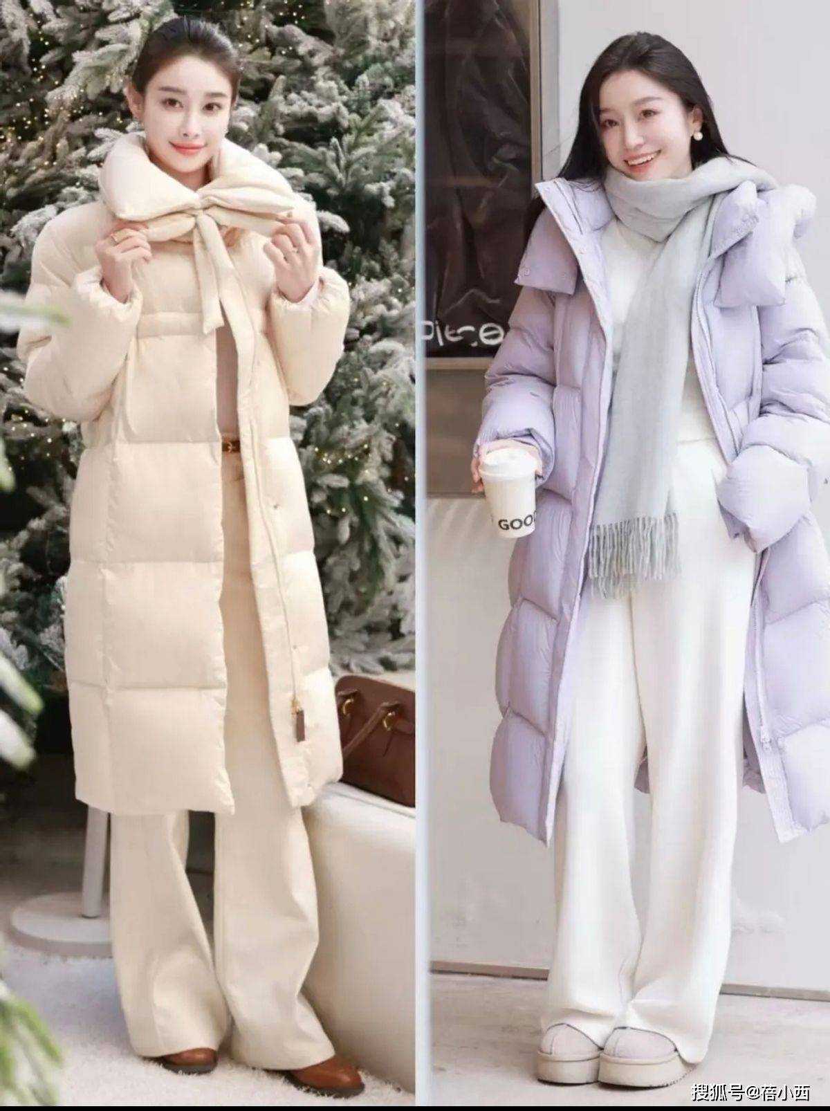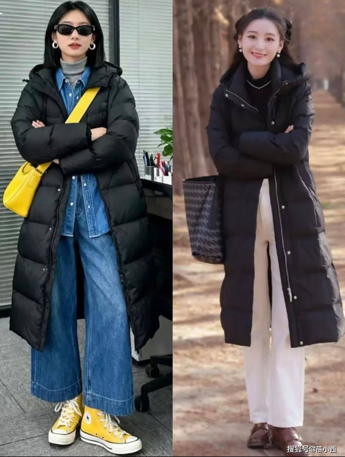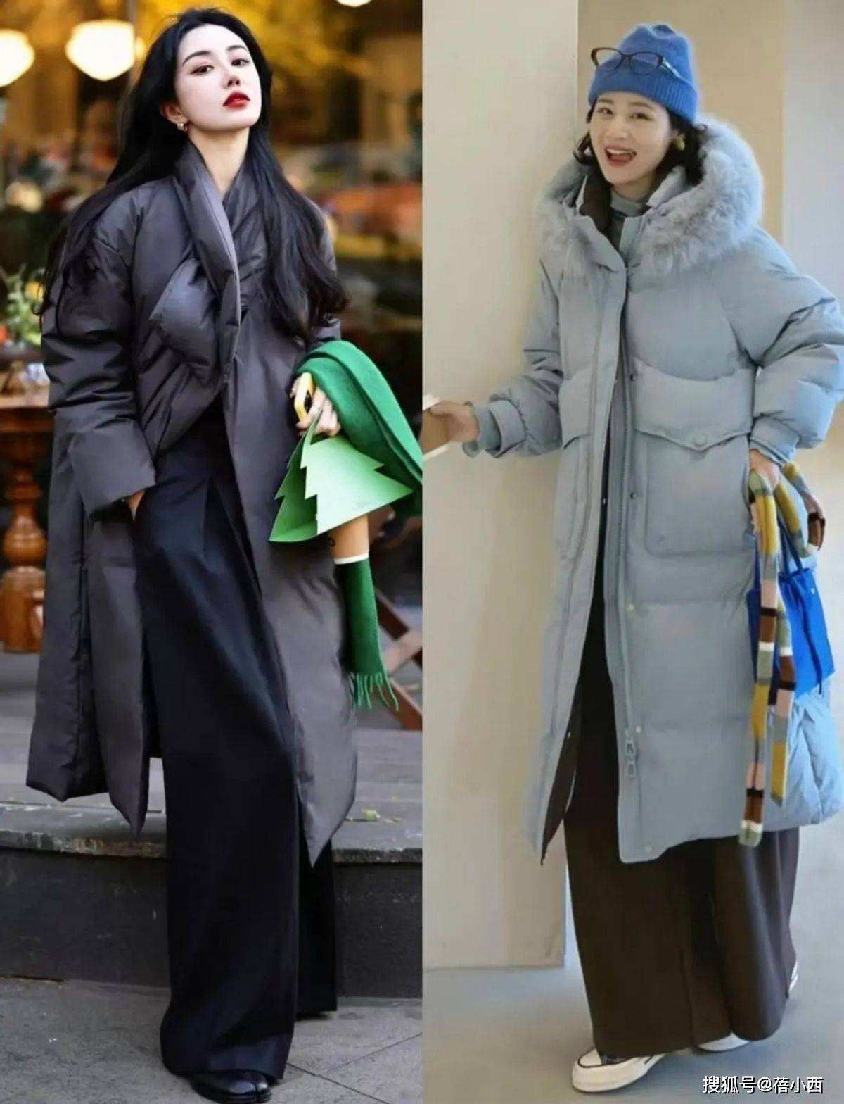长羽绒服的蓬松感与阔腿裤的宽松感叠加,稍不注意就会穿成“移动棉花糖”,而“松紧对比”的廓形平衡术,能精准中和两者的膨胀感,让造型利落又显瘦,比如廓形长羽绒服搭配修身的打底衫,敞开穿羽绒服,立马就可以收缩围度,显瘦一圈。