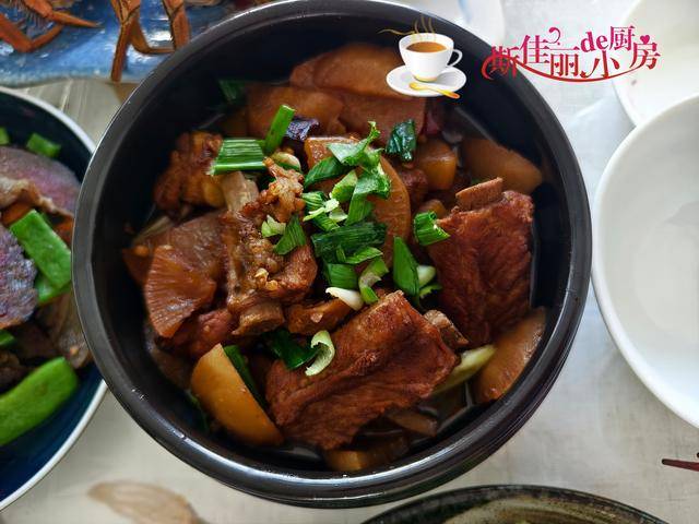 第四道菜: 白萝卜烧排骨,排骨一直是深受人们欢迎的肉类, 既有鲜肉的口感,还有嚼劲且不油腻, 口感和营养兼得。 排骨的做法多样,煎、炒、炖、炸、蒸、煲等,将它搭配上时令菜萝卜一起炖煮,排骨肉质酥嫩,萝卜软烂鲜美,家常又美味。