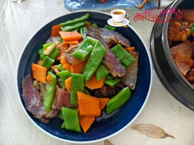 制作过程: 将腊肉用热水清洗干净, 切成片备用;烧锅水加入少许盐和几滴油,将四季豆放进锅中焯煮至九成熟后捞出备用; 烧热锅放入少许油和水,将腊肉片放进锅中去煮,焖煮3分后再微微煎出油脂,将准备好的四季豆和胡萝卜片放进锅中翻炒几下,直至四季豆完全熟透, 加入少许盐调味,翻炒均匀即可。