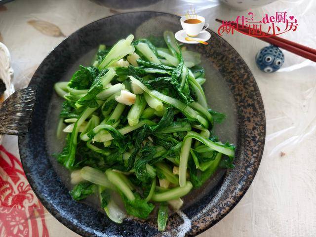 第五道菜: 清炒小白菜,小白菜一年四季都有,是百姓餐桌上最常见的蔬菜,营养丰富,口感爽脆,色泽翠绿,价格便宜,最需两种简单的调味料,盐和蒜末,将能成就一道最美味的家常小炒。