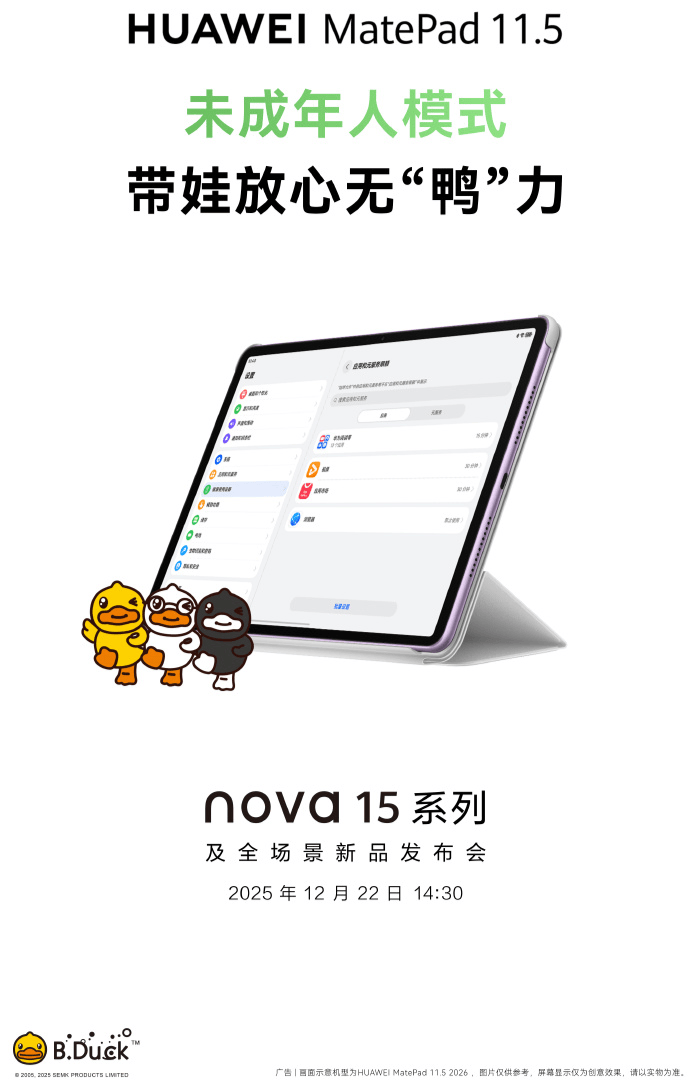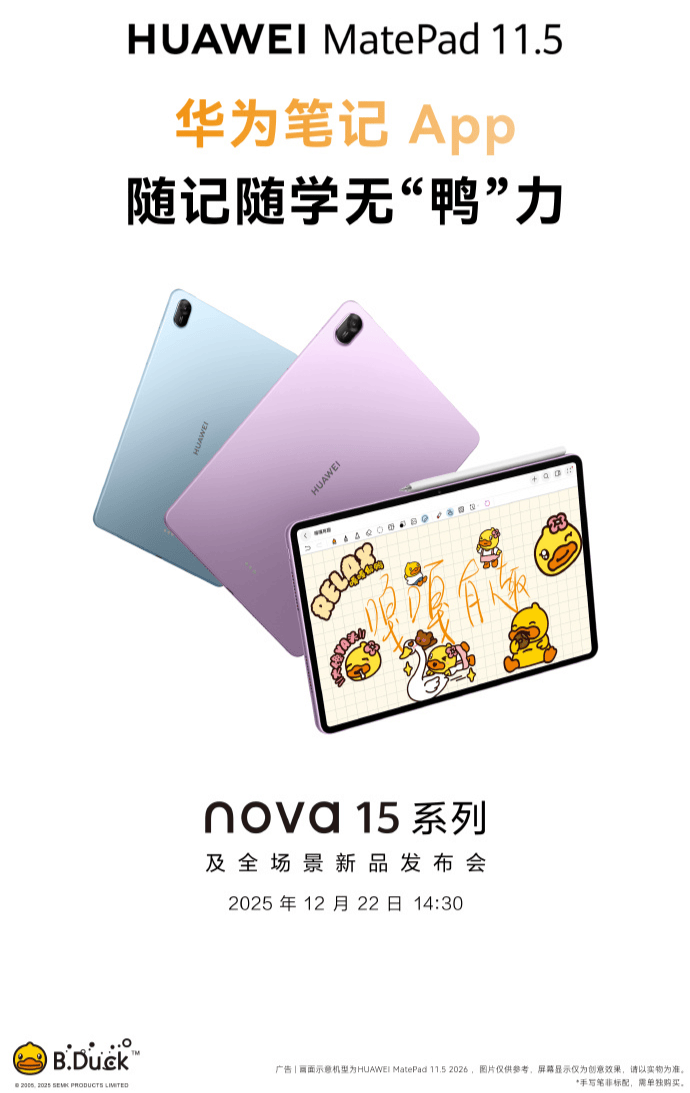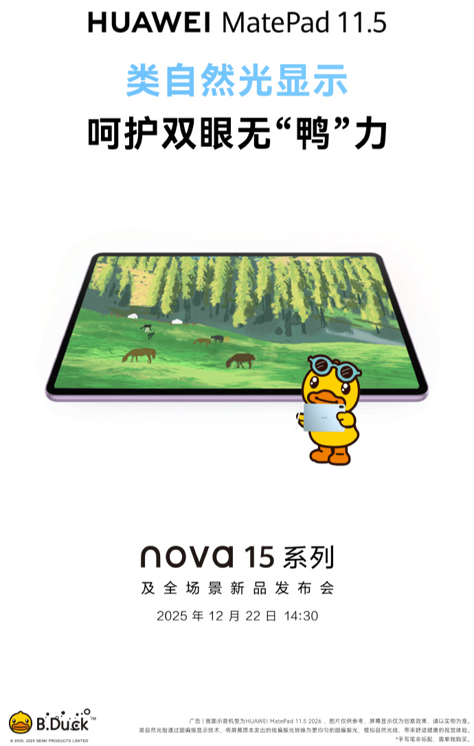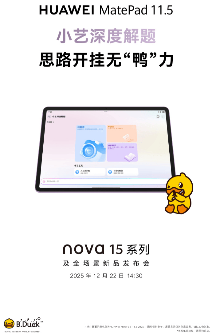 据官方预热海报显示,新款华为 MatePad 11.5 将支持类自然光显示、华为笔记 App、小艺深度解题以及未成年人模式等功能。海报中出现的 B.Duck 小黄鸭形象,也暗示本次产品或将与该 IP 推出联动内容。