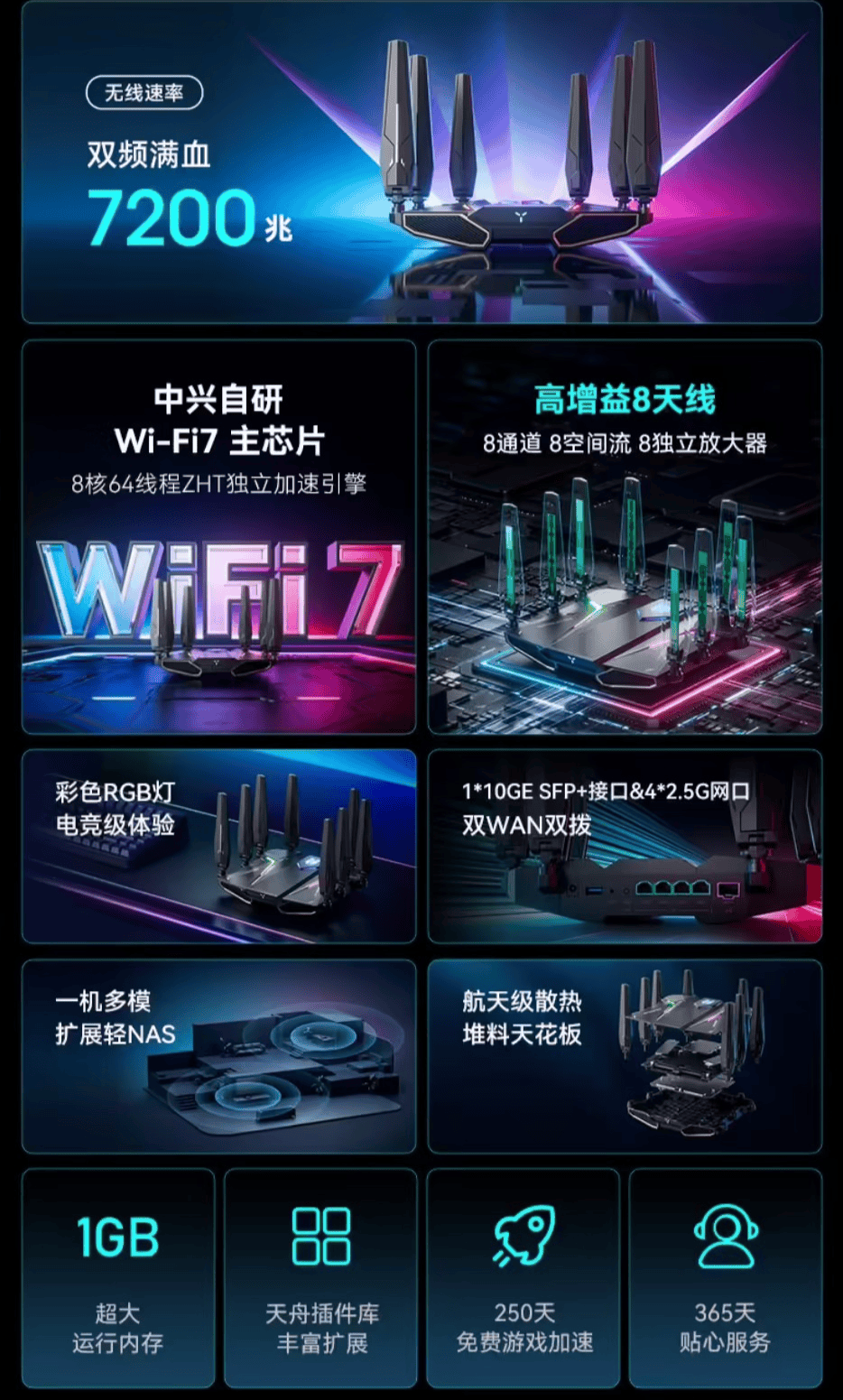 新品配备 1GB 大,宣称最高支持 253 台设备同时连接,其中有线上下行至高 10024 兆,双频无线至高 7140 兆。
