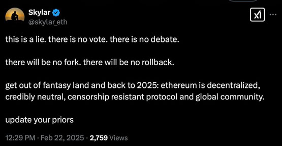 这种未经证实的消息迅速传播,引发了不少讨论。很多人觉得这违背了区块链的精神,甚至联想到了当年以太坊因为回滚事件而分叉出 ETC 的历史。好在,以太坊基金会的 Devcon 负责人 Skyler Weaver 及时出面辟谣:“这是彻头彻尾的谎言!不会有投票,不会有辩论,更不会有分叉或回滚!”