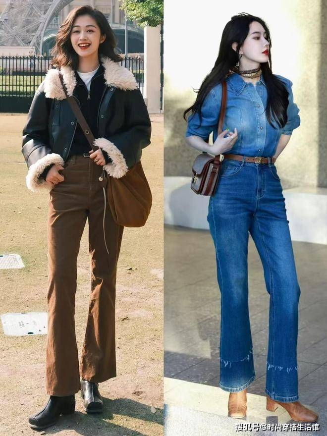 如果想要穿出复古一些的造型,建议大家尝试一下九分喇叭裤和短靴的搭配。比如下图中的这种“微喇设计”的九分裤,微喇的设计适当加强了下裤腿的宽松度,非常适合小腿肌肉明显或者小腿外翻的女性。建议大家搭配上“靴筒略窄”一些的短靴,更能够营造出松紧反差,穿出显瘦显腿细的效果。