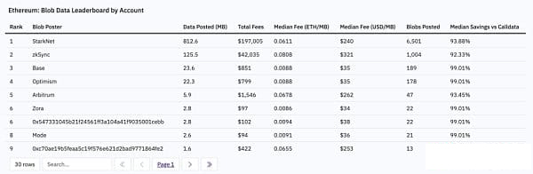 目前,率先使用 blob 的主要 Layer2 (L2) 包括 Starkware、zkSync 和 OP Stack 链(如 Mainnet、Zora 和 Base)。Arbitrum 也在过去几个小时内加入了行列。从目前的数据来看,前景一片光明。