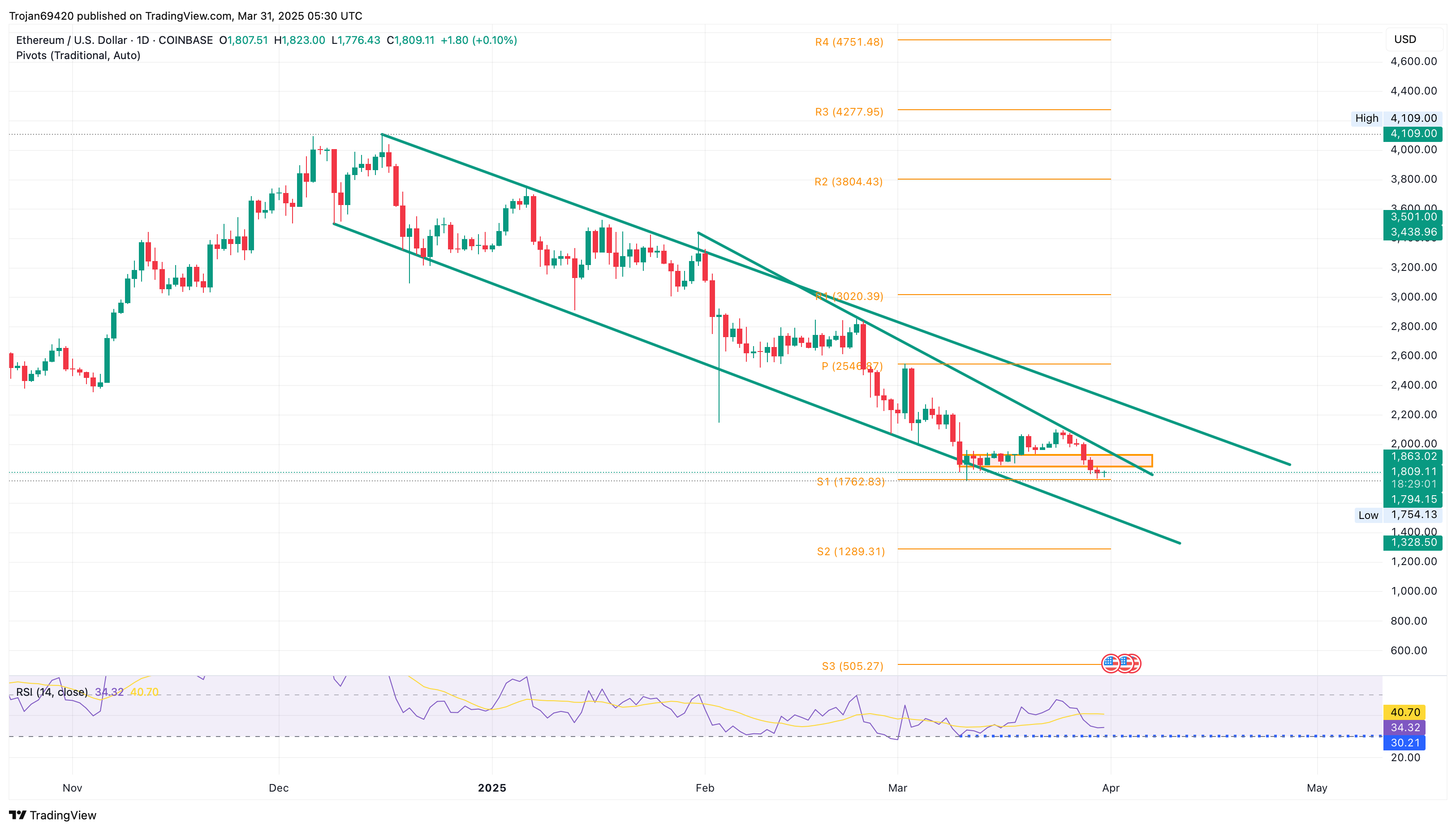 从日线图来看,以太坊价格连续六根阴线,累计跌幅接近 12%。这波下跌使得以太坊重新测试了 1762 美元的 S1 支撑位。