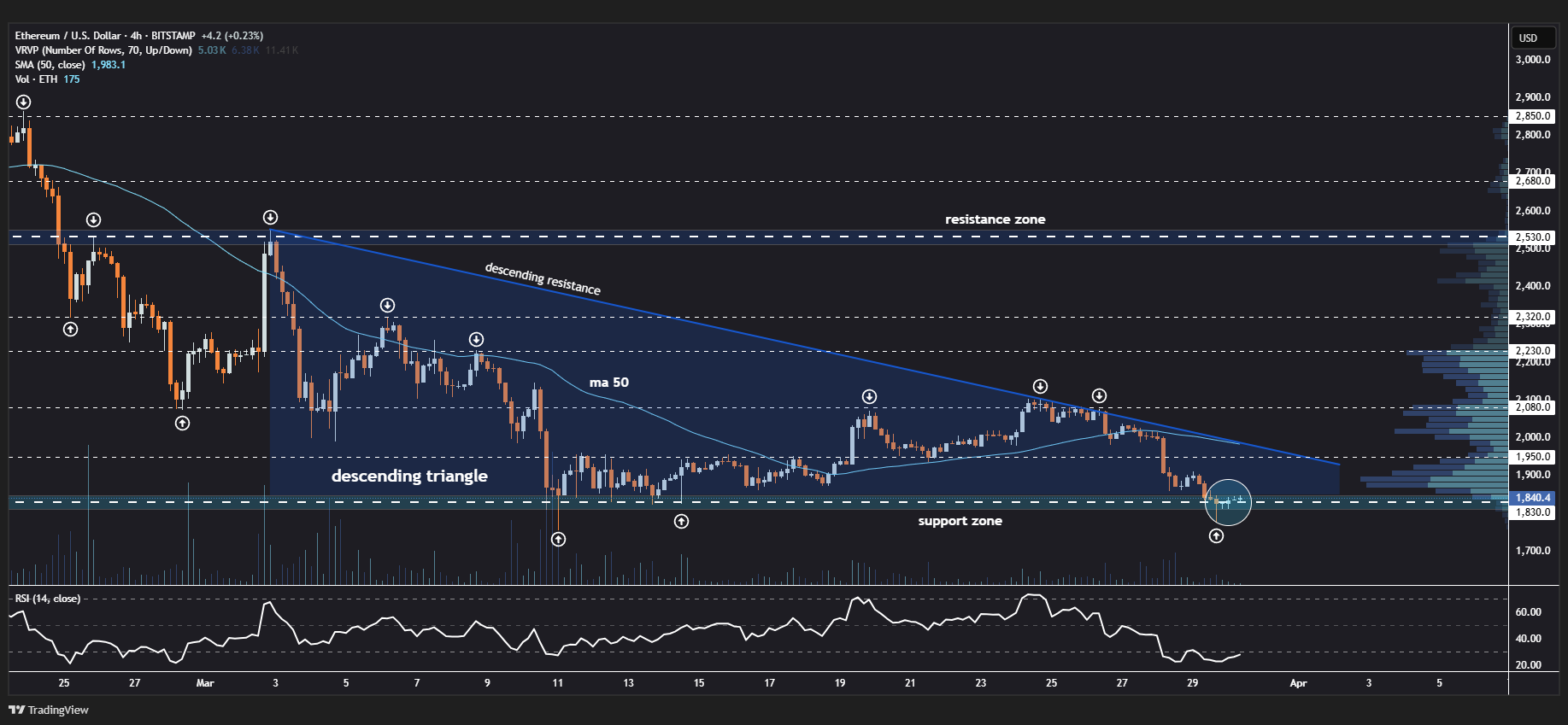 不过,在这一关键支撑位附近,以太坊的价格走势出现了一些积极信号。日线图上出现了一根十字星,表明多空双方在此展开了激烈的争夺。考虑到 3 月初以太坊也曾在此处获得支撑并反弹,因此,双底反转的可能性依然存在。