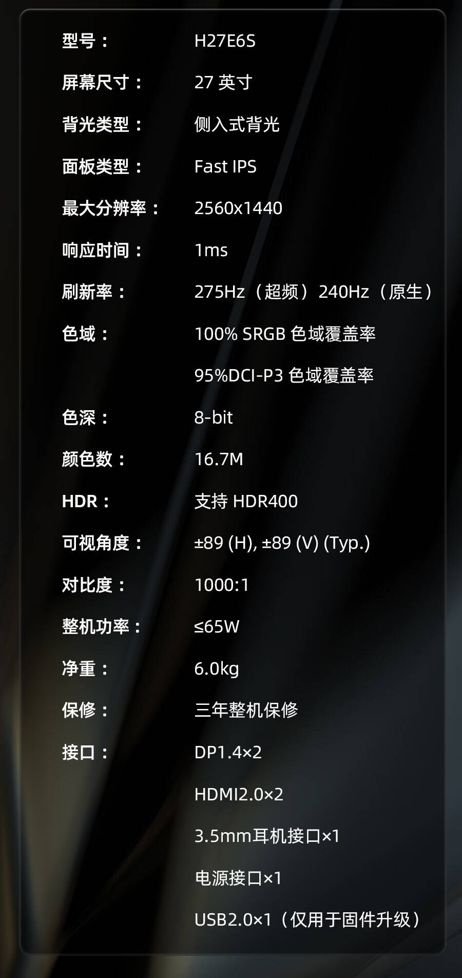 【太平洋科技快讯】12 月 18 日消息,KTC 发布了一款 27 英寸 2K 275Hz 显示器 H27E6S。该显示器采用 2K 雾面防眩光屏幕,支持原生 240Hz 刷新率、超频 275Hz 刷新率,以及 100% sRGB 色域、HDR 400、MPRT、硬件低蓝光。