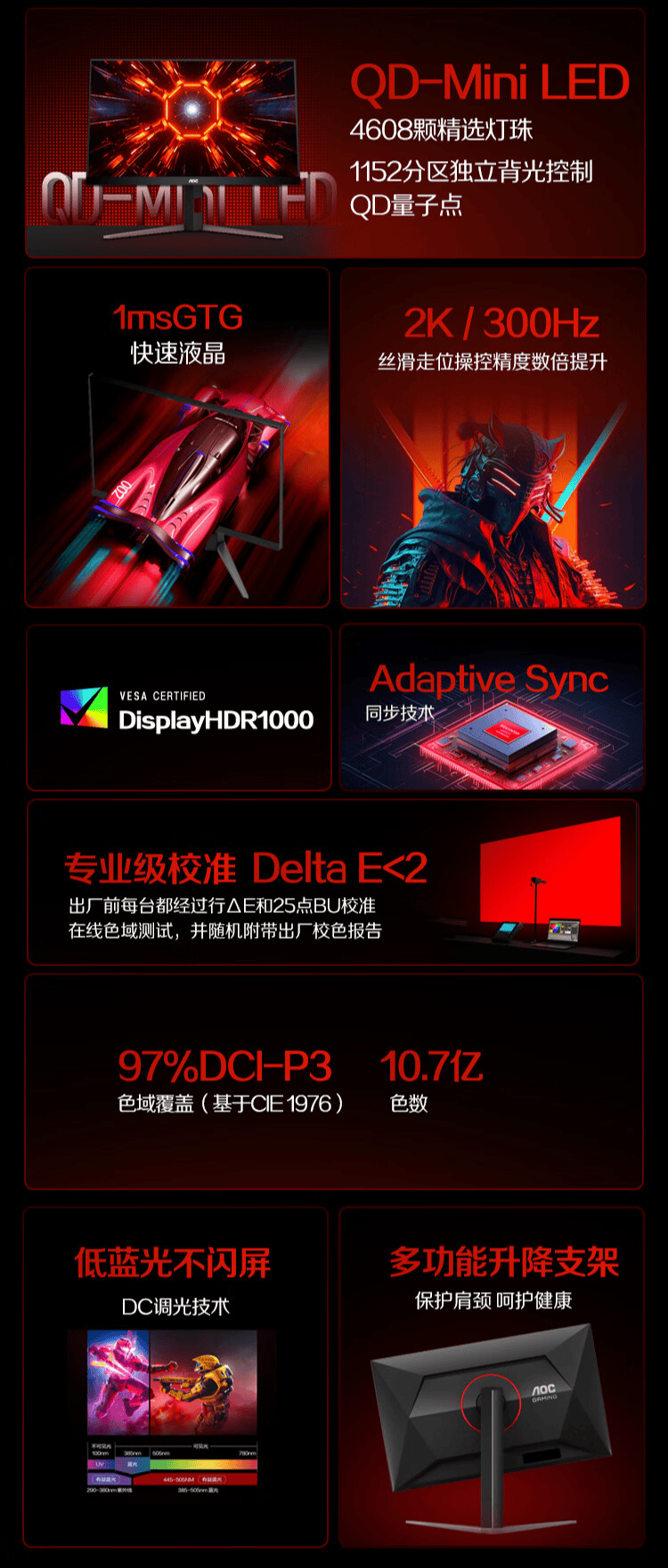 据悉,该显示器采用 2560×1440 分辨率 300Hz 全阵列直下式玻璃基 QD-Mini LED 背光 Fast VA LCD 面板,拥有 1152 个独立背光控制分区和 4608 颗 LED 灯珠。支持 4 档控光模式,SDR/HDR 亮度分别为 450nits/700nits,HDR 峰值亮度达 1200nits。