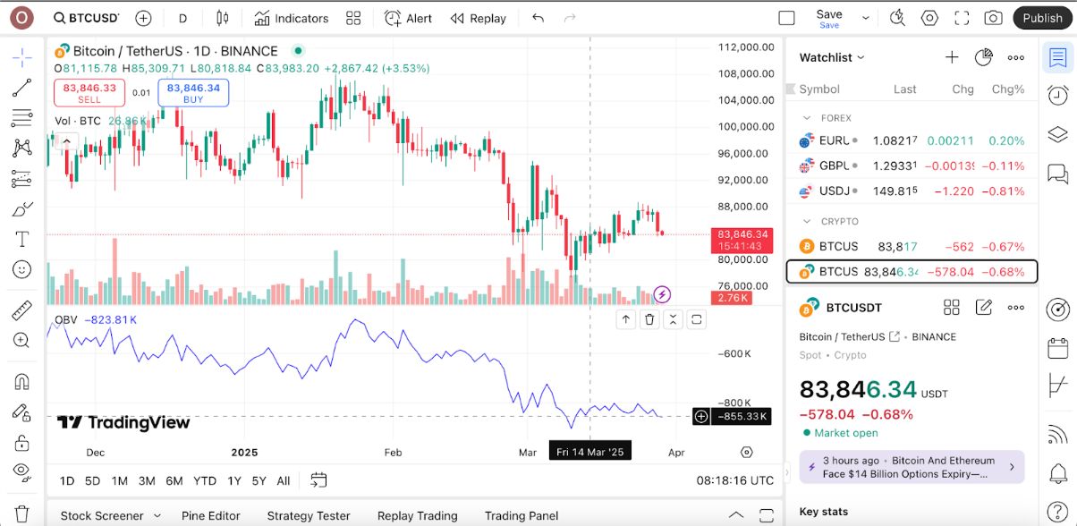 在这一轮上涨之后,图表显示比特币价格开始在约 80,000 美元附近进入盘整阶段,蜡烛图的形态趋于收敛,交易量也随之减弱。在这种情况下,OBV 曲线趋于平缓,表明买卖双方的力量大致相当。这通常意味着市场缺乏明确的方向,交易者可能会将此视为观望信号,等待更明确的走势出现后再做决定。