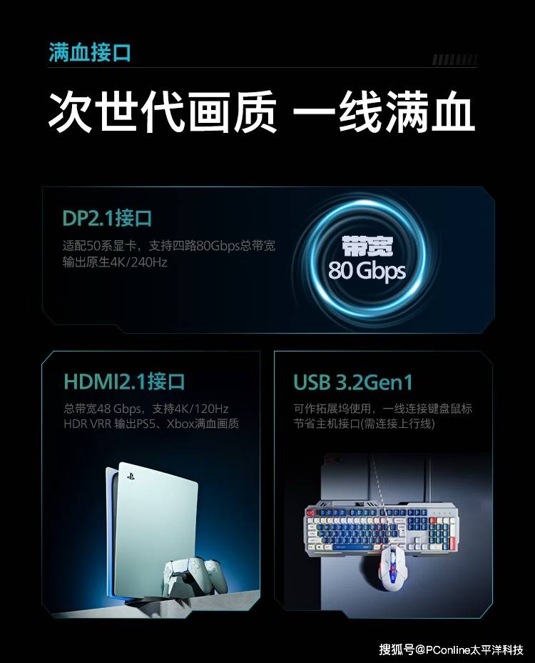 配合满血的HDMI 2.1和DP 2.1接口,无论是连接高性能 PC 还是次时代主机,都能跑满画质,不存在接口带宽瓶颈。