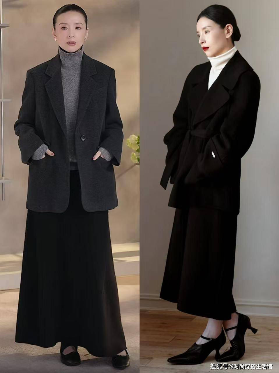 最后我们穿大衣还可以考虑搭配长裙,毕竟选择轻盈舒适的裙子能够有效的平衡大衣的厚重感,同时还能增添女性的柔美气质,瞬间就可以搭配无痕裤、紧身裤带来的厚重感,宽松的裙摆随风飘扬,完美的凸显出整个造型的协调感和气质感,其次我们穿的裙长超过大衣长度,轻松就可以凸显出层次感,整个造型也变得更加时髦和高级。