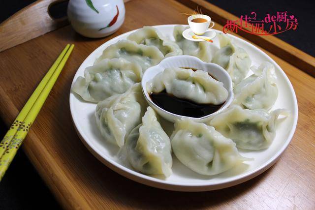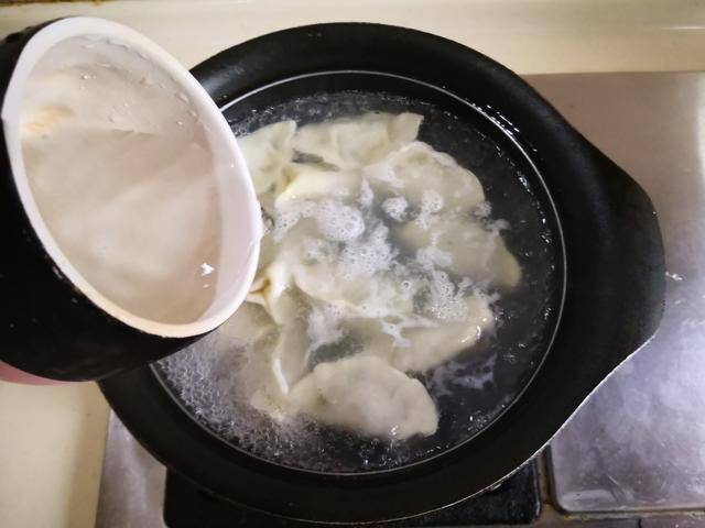 5. 烧锅开水,将包好的”荠菜虾仁饺子“放进锅中加盖煮, 煮开后解开盖, 加入少许水继续煮; 再次煮开后再加入少许水煮开后,直至饺子全部浮出来后, 再继续煮上一分钟后捞出,再搭配上蘸料即可。