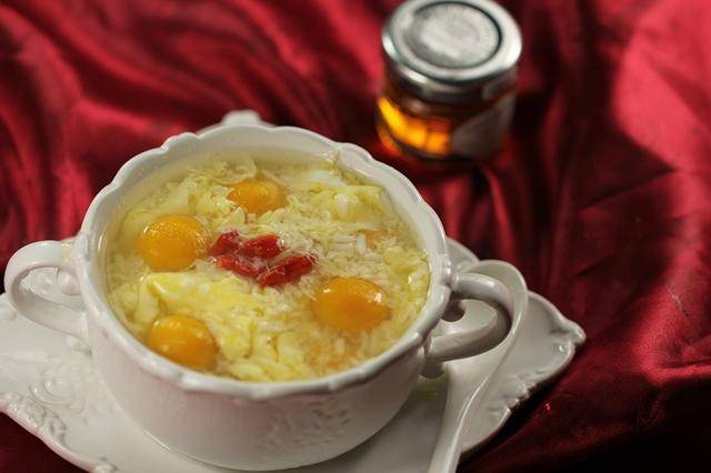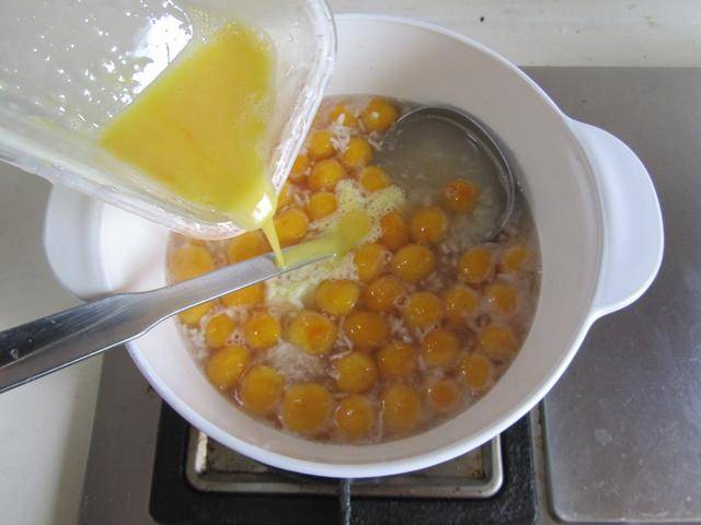 5. 再倒入准备好的鸡蛋液, 煮至形成蛋花后关火, 按个人口味加入少许冰糖融化即可。