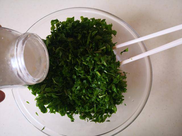 2. 将荠菜洗净后切成小碎末, 放入腌制好的虾仁馅料中,再加入少许橄榄油和盐,拌均匀腌制3分钟;