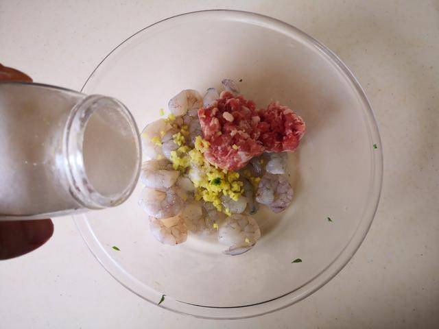 制作过程: 1, 将鲜虾去壳后挑出虾鲜, 切成小碎末,加入少许肉馅、料酒、淀粉、姜末等调味料,顺着一个方向搅拌上劲,腌制5分钟备用;
