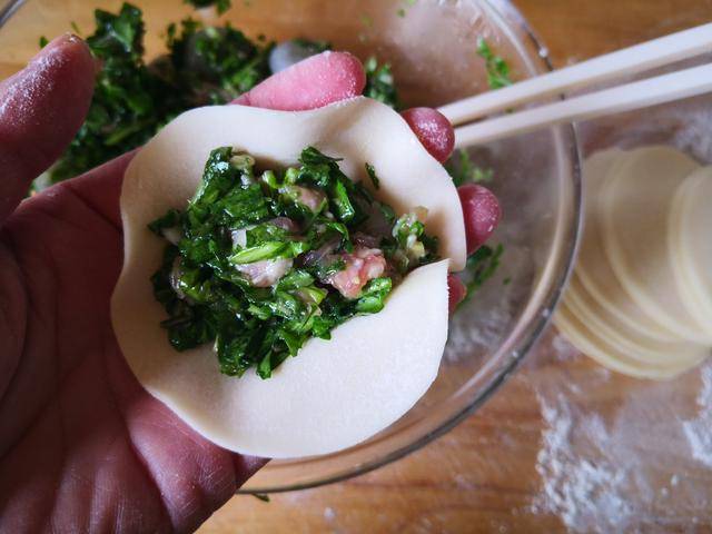3. 饺子皮加入少许荠菜虾仁馅料,