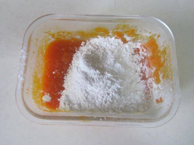 2. 加入适量的糯米,将其和成光滑的面团, 将取少许南瓜糯米面团将其搓成小南瓜汤圆备用;