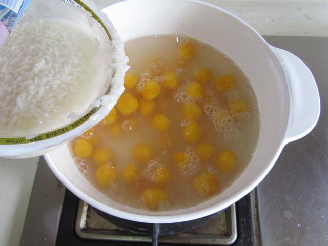 4. 将南瓜小汤圆煮至全部浮起来后,倒入1小碗米酒;