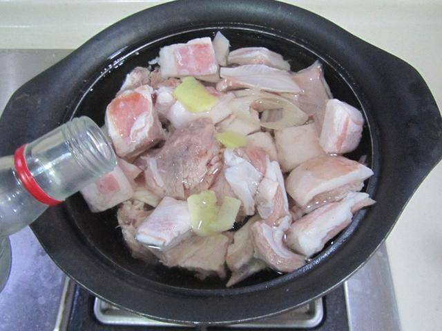 制作过程:1. 烧锅水,将切成麻将大小的羊肉冷水下锅焯煮, 加入姜片和葱段、高度白酒去腥,焯出浮沫后捞出放入电炖锅中;