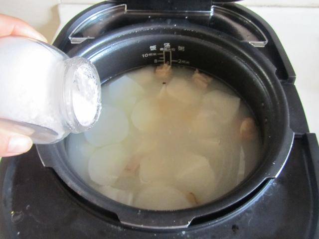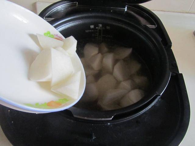 2. 白萝卜去皮后切成滚动块放入电炖锅中,加入少许姜片,加入适量的水,注意水要一次性加足,不要中途加水;