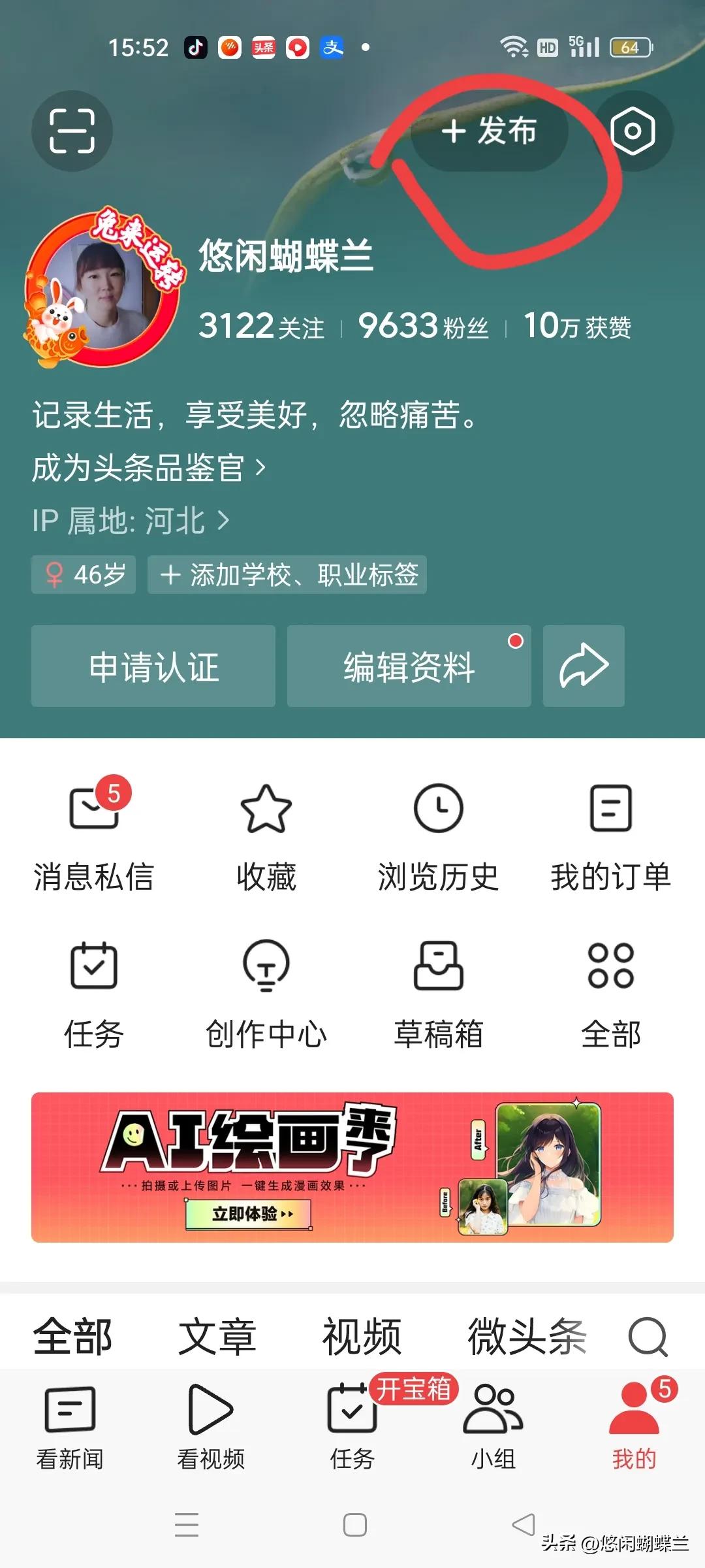 第一步:打开头条,点击“我的”,再点右上角的“发布”,选择“文章”,就可以开始创作啦!