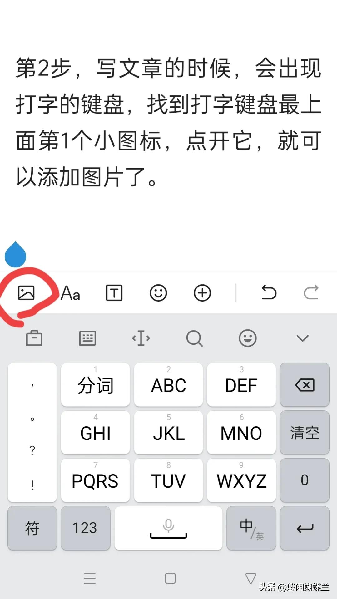 第二步:在编辑文章时,你会看到打字键盘。找到键盘最上面第一个小图标,点开它,就能添加图片了!