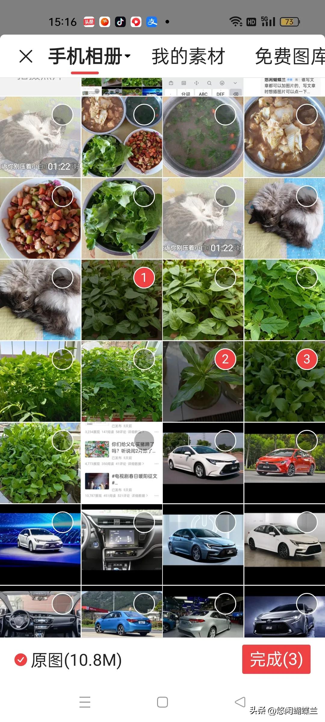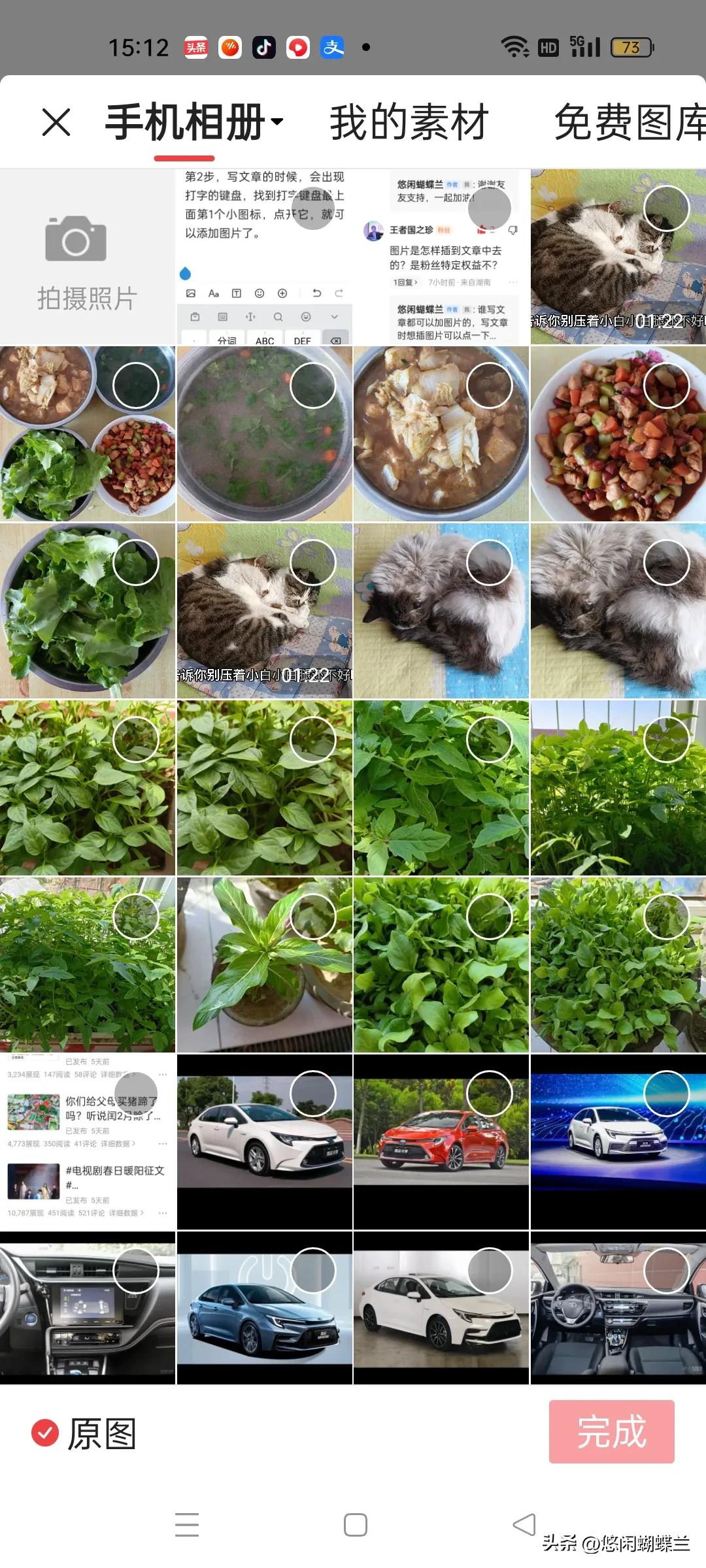 如果想用手机相册里的照片,直接选择需要的图片,点击照片上的圆圈,选定后点击右下角的“完成”,照片就添加到文章里了!