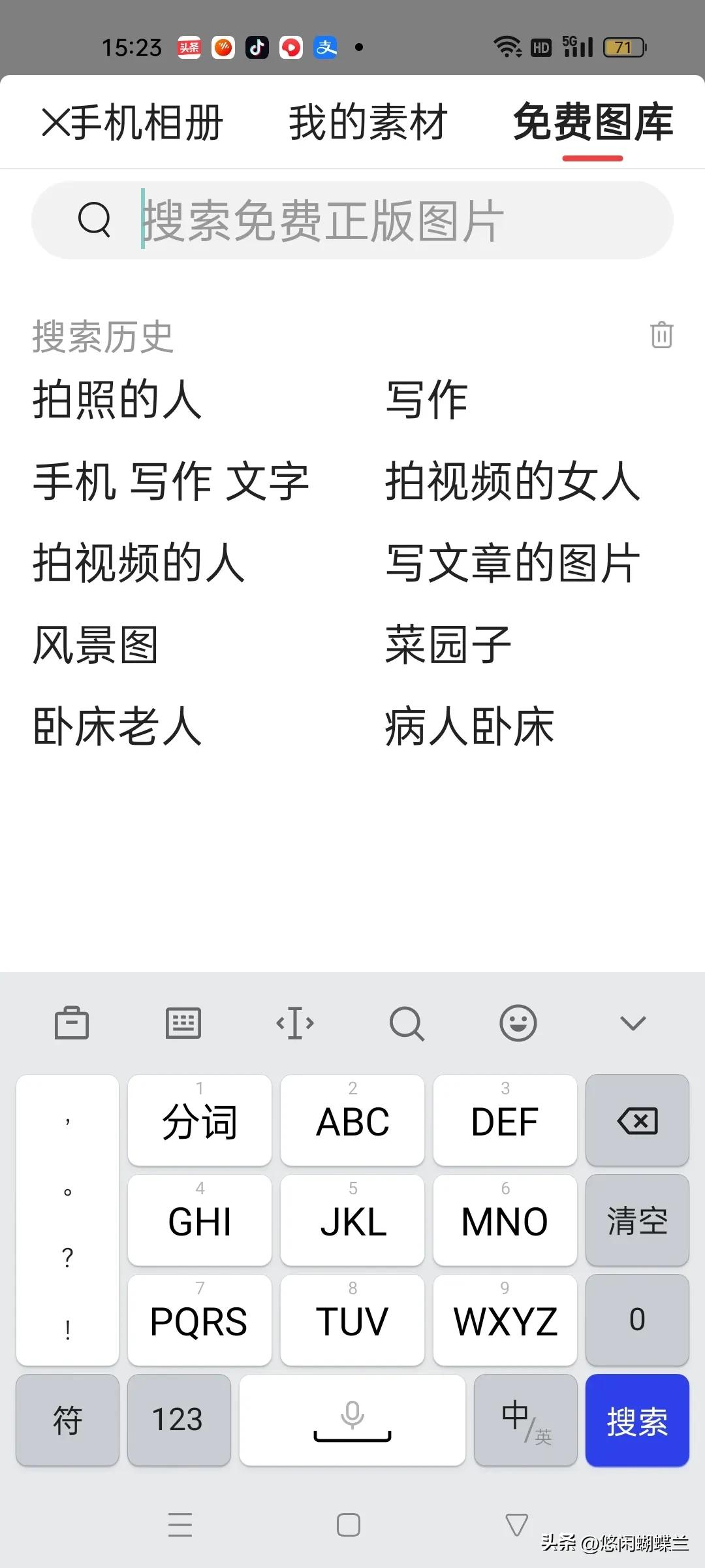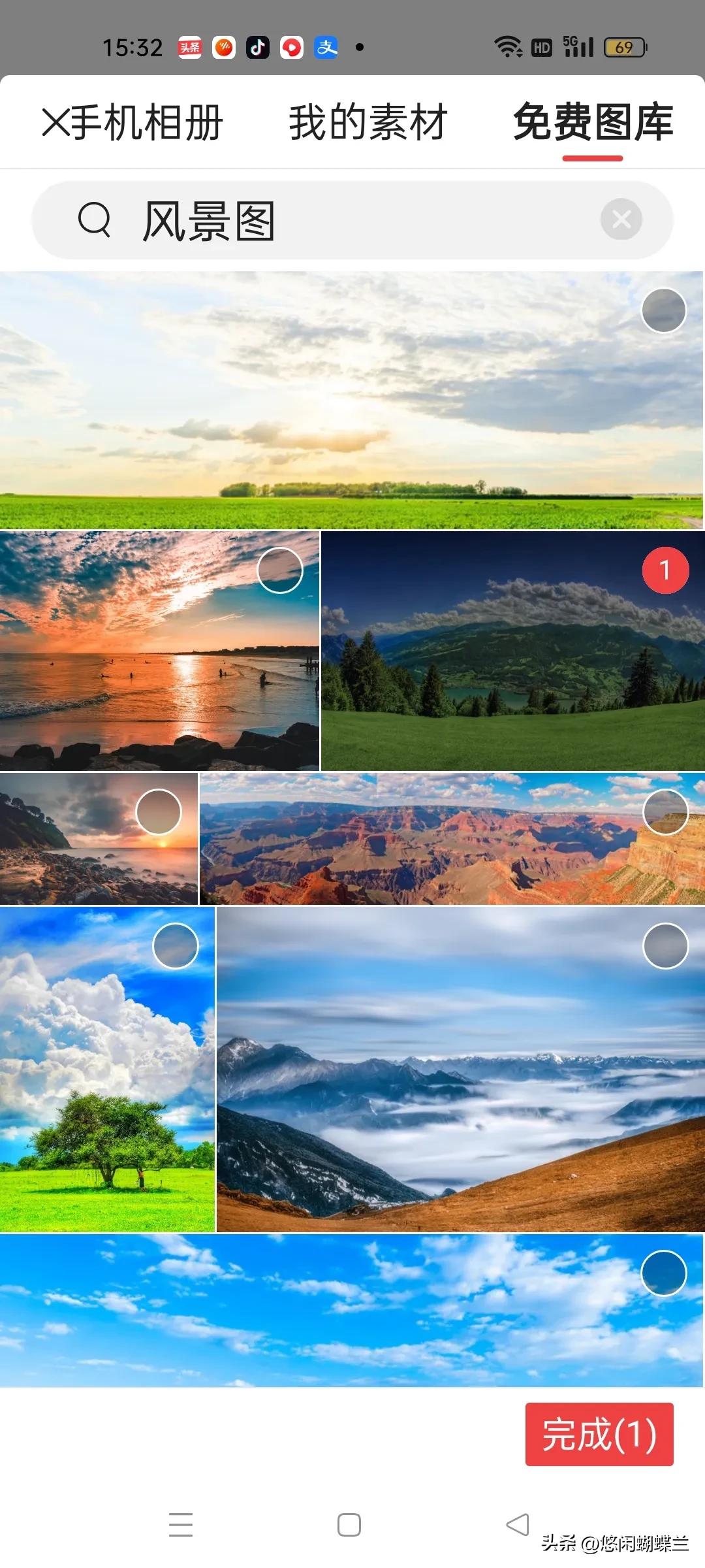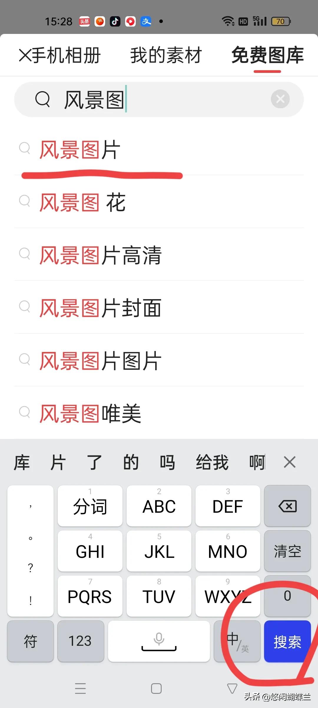 如果手机相册里没有合适的照片,可以在免费图库里找。选择“免费图库”,打开后会出现搜索页面,输入关键词,比如“风景图”,就会出现很多相关的图片。