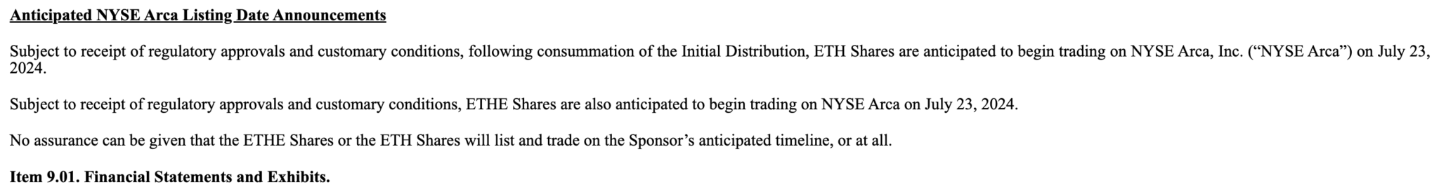 不仅如此,灰度也在其以太坊现货ETF(ETHE)的申请文件中明确指出,如果获得监管批准并满足相关条件,ETHE 股票预计将于2024年7月23日开始在纽约证券交易所(NYSE)的Arca 电子交易平台上市。看来,7月23日这个日子,真是越来越有盼头了!