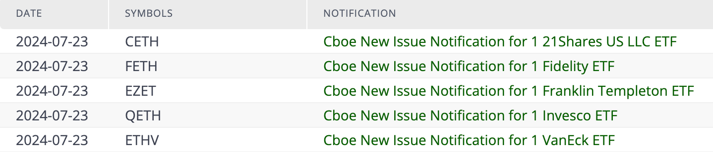 各位币圈的朋友们,是不是已经等不及了?以太坊现货ETF的上市消息,可谓是牵动着大家的心。现在,好消息似乎真的要来了!芝加哥期权交易所(Cboe) 官网发布信息,包括vaneck、invesco、fidelity、21shares、franklin templeton等多家机构的以太坊现货ETF,预计将于7月23日正式开放交易。