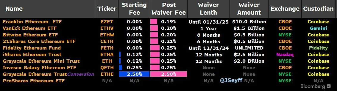 根据彭博ETF 分析师 James Seyffart 整理的数据,各家机构的费用情况如下: