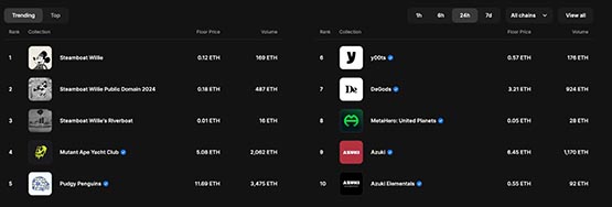 除了 Steamboat NFT 系列,还有创作者创建了 Willie 和 Willie's Riverboat 这两个系列。与整体市场相比,《汽船威利号》无疑受到了 NFT 社群的更多关注。