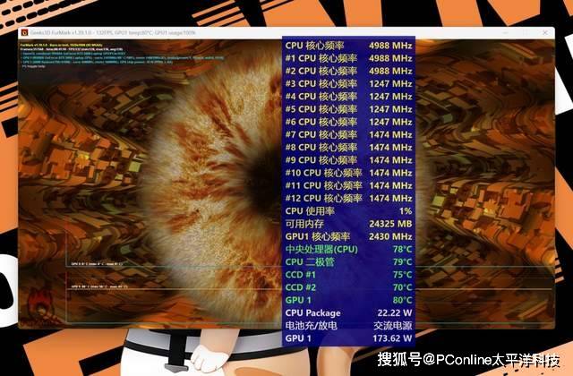 FurMark 1920*1080 8xMSAA+AIDA 64系统稳定性测试Stress FPU,双烤30分钟后,CPU功耗45W,CPU二极管温度80度,CCD1温度79度,CCD2温度78度,CCD1频率与CCD2频率1.45GHz~1.5GHz;GPU功耗175W左右、频率2400MHz左右,温度80度。
