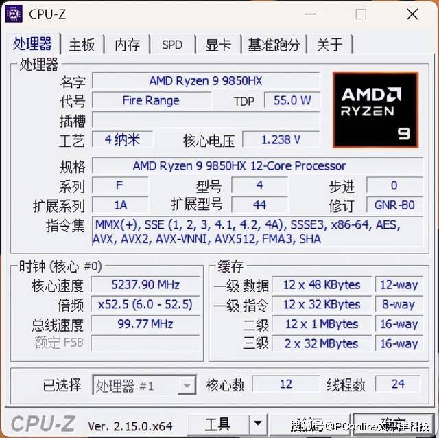首先是CPU,AMD锐龙9 9850HX,最新一代Zen5核心架构,TSMC 4nm FinFET工艺,双CCD设计,共12核心24线程,三级缓存共64MB,基础频率3.0GHz,至高5.2GHz,TDP 55W,集成2Cu的Radeon 610M核显。