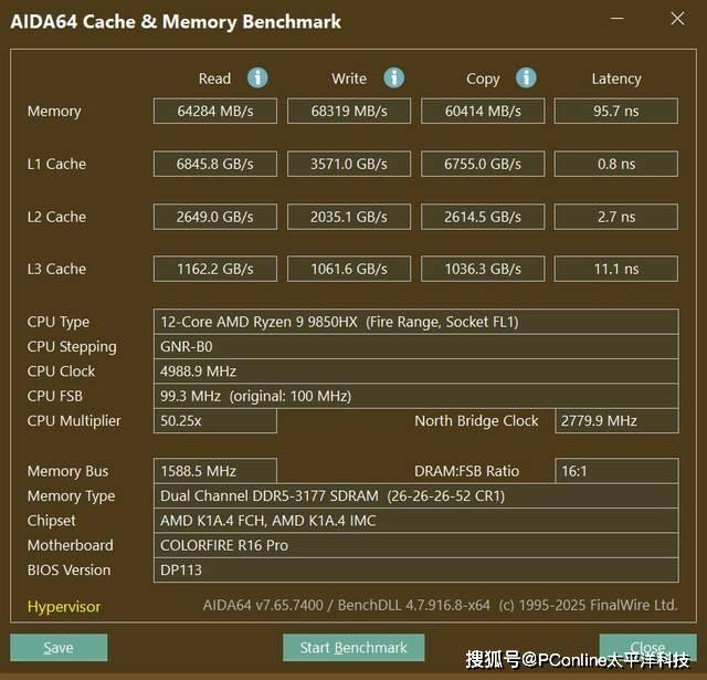 使用AIDA64 Cache&Memory BenchMark,内存的读、写、复制速度分别为64284MB/s、68319MB/s、60414MB/s,延时95.7ns。