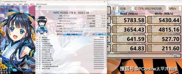 在CrystalDiskMark中,这块1TB YMTC PC41Q的最大读取速度5783MB/s、最大写入速度为5430MB/s。(*由于测试时间较为紧迫,测试硬盘时为脏盘状态下进行的)。