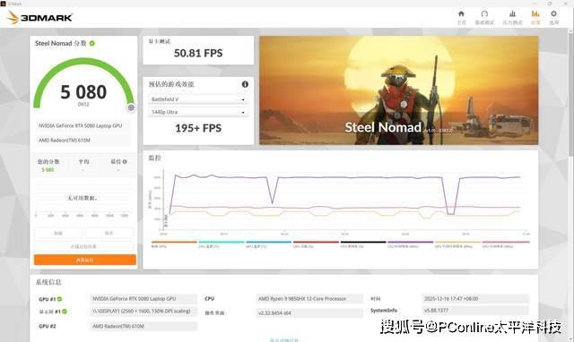 在相比Time Spy负载更高、调用DX12和Vulcan API的Steel Nomad测试中得分5080分。