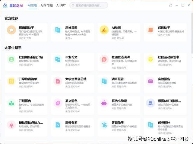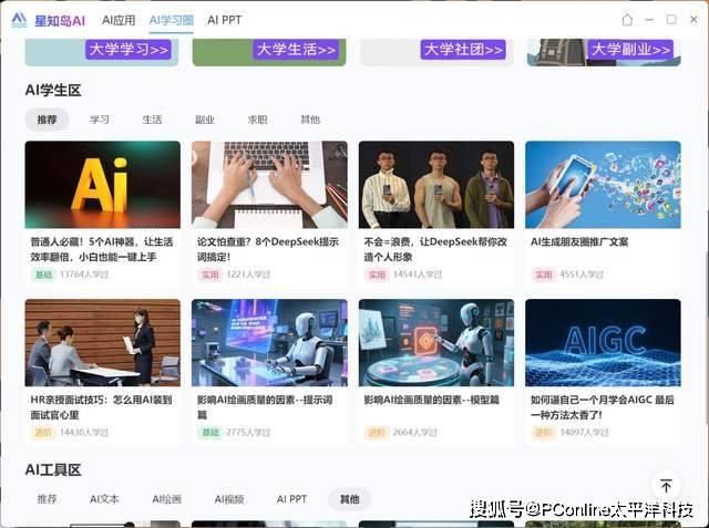 更新主要新添了两大板块,AI学习圈与AIPPT。AI学习圈为大学生群体及打工人提供了各类型的AI教程,帮助提升学习与工作效率。