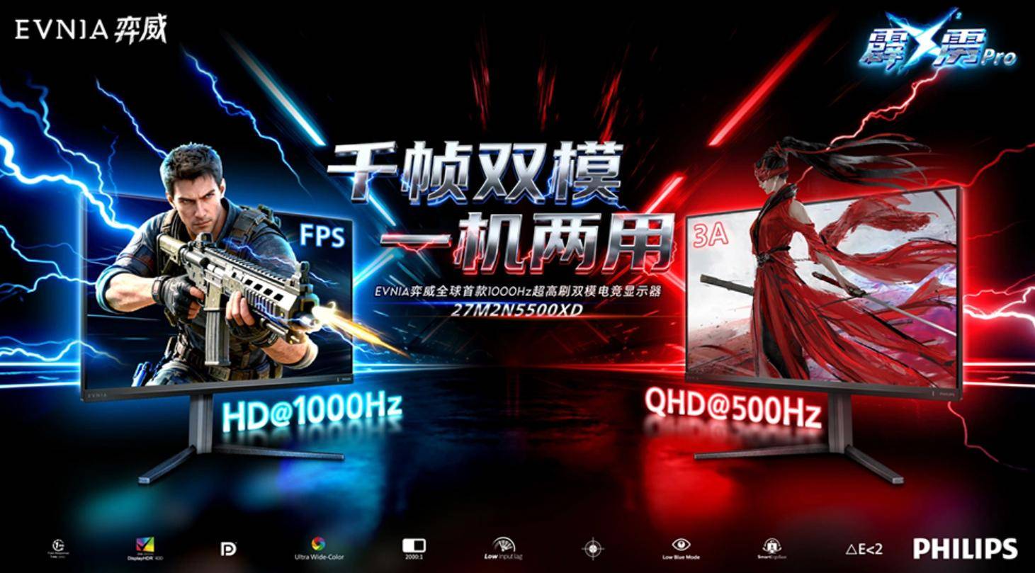 这次1000Hz的显示器是由TP VISION旗下两大品牌发布的,分别是飞利浦和AOC,这两家品牌共用相同技术和相同屏幕面板,我们已经屡见不鲜了。当然外形设计上两个品牌肯定不同,不过在显示器的具体性能上则基本一样。飞利浦的Evnia 27M2N5500XD和AOC AGON Pro AGP277QK都使用了27英寸的IPS面板,拥有1440P分辨率和500Hz原生刷新率。当然这两款显示器都有双模模式,可以在切换到720P分辨率的时候,将刷新率提升到1000Hz,这也是目前电竞游戏显示器常见的设计。
