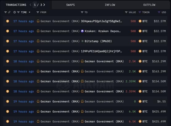 Arkham 的数据显示,德国政府相关的地址从 6 月 19 日开始进行了一系列资产转移。其中,最引人注目的是分别向 Kraken 和 Bitstamp 两家交易所转移了 500 枚 BTC,另外还向 Gemini、BitFlyer 和 Coinbase 分别转移了 40 枚、40 枚和 30 枚比特币。这些举动很可能意味着德国政府正在准备出售这些资产。