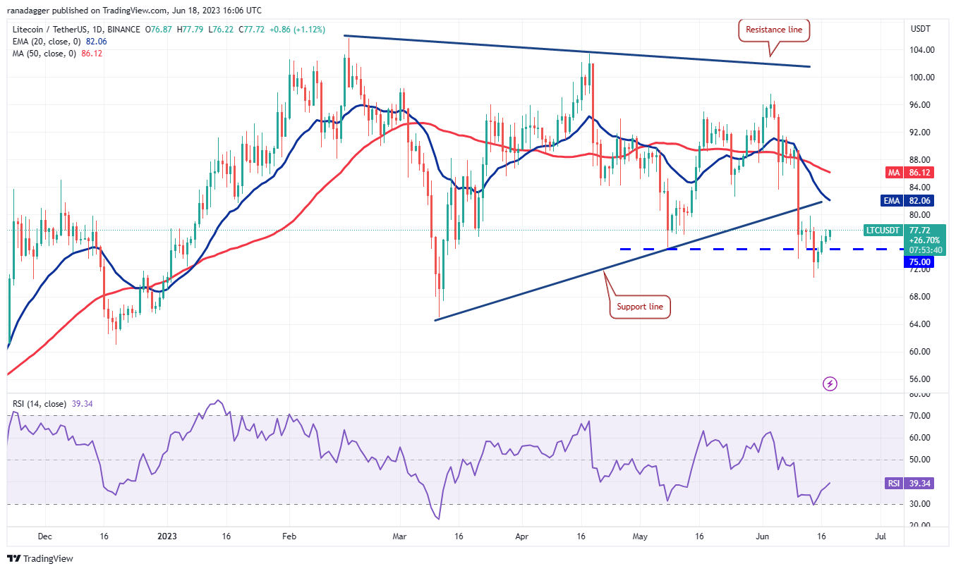 莱特币(LTC)在6月10日跌破对称三角形形态,表明空头占据上风。卖家在6月14日将价格拉低至75美元的即时支撑位下方,但无法以此为基础继续上涨。