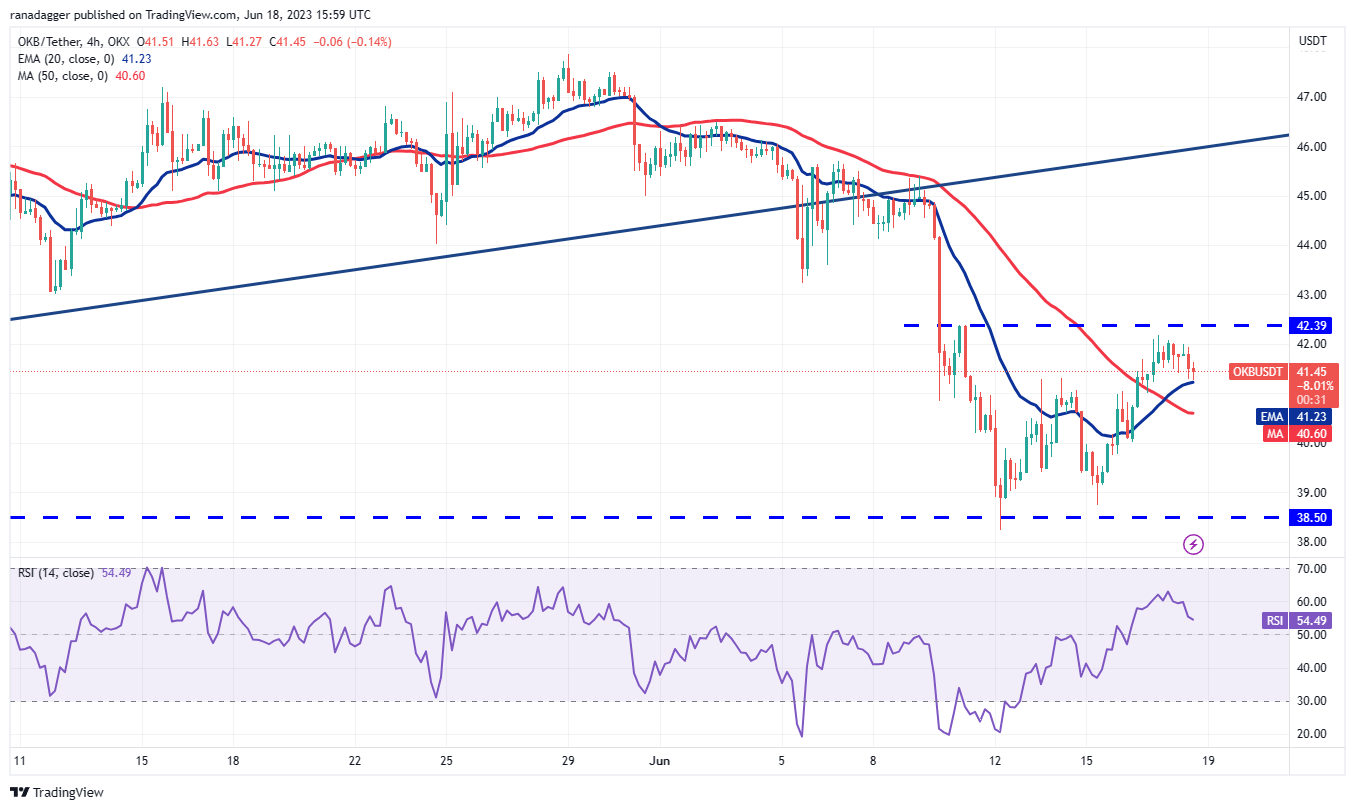 价格已触及20日均线(42.73美元),这是一个值得关注的重要水平。如果价格从当前水平下跌,则表明市场情绪仍然消极,交易员逢高卖出。这可能对38.50美元的支撑构成严重威胁。如果这个水平让位,OKB/USDT对可能会跌至35美元,最终跌至30美元。