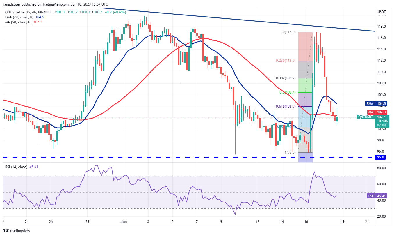 但是,空头还没有放弃,他们正在激烈地捍卫下降趋势线。卖家将试图将价格降至95美元以下,而多头将试图将QNT/USDT货币对维持在其上方。