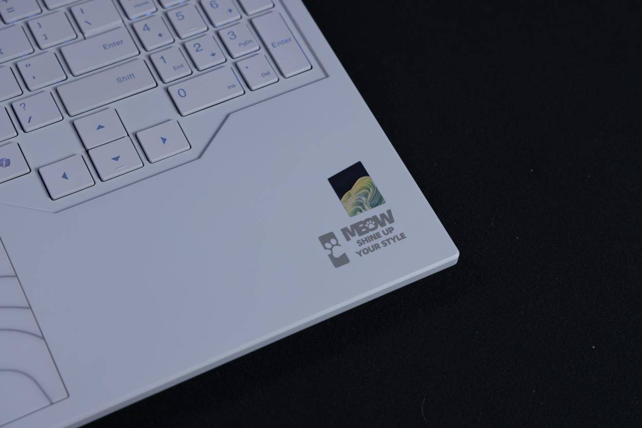 打开屏幕后,C面触摸板采用了与A面相同的ID设计,右下角也有MEOW的系列LOGO与Slogan。