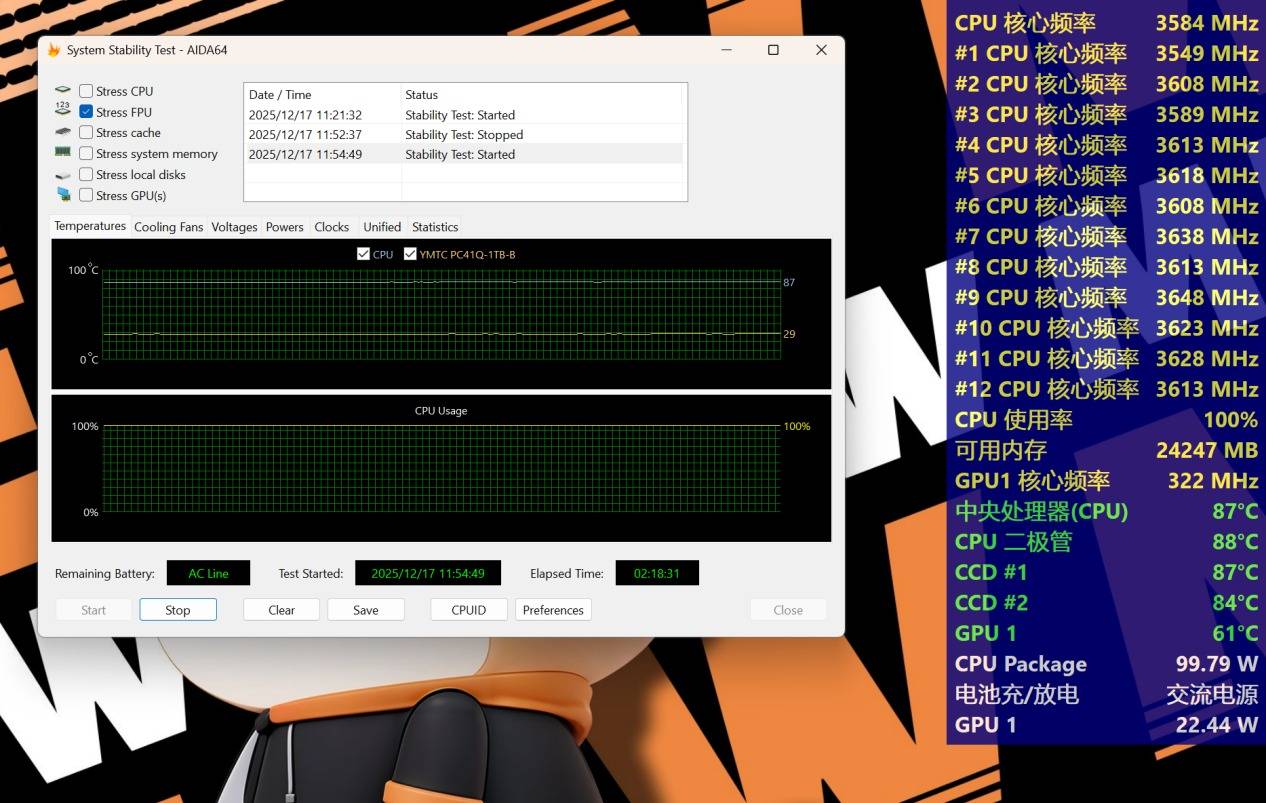 使用AIDA 64系统稳定性测试Stress FPU进行CPU单烤测试,30分钟后,功耗100W左右,CPU二极管温度88度,CCD1温度87度,CCD2温度84度,CCD1频率与CCD2频率都在3.6GHz左右。