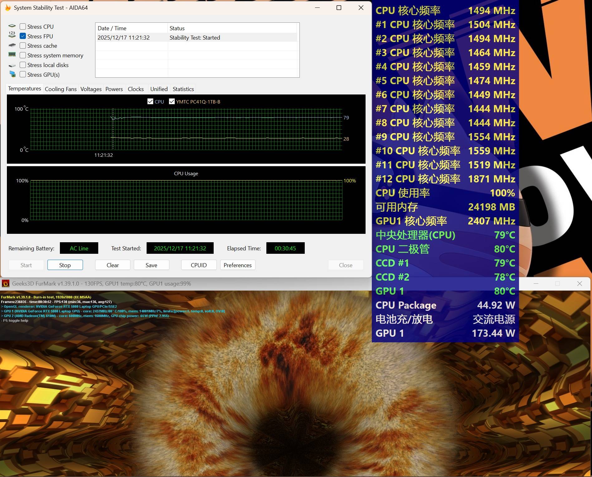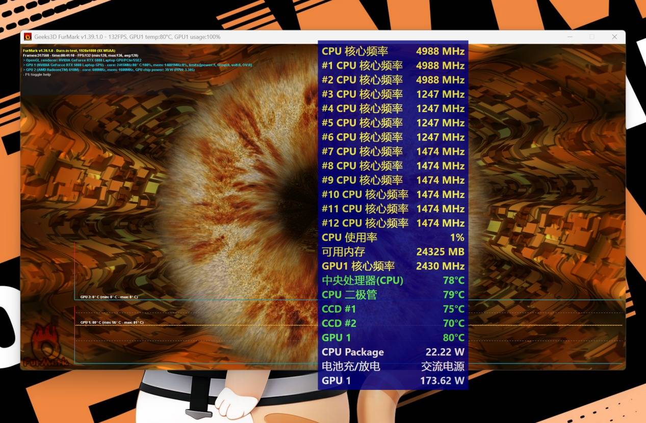FurMark 1920*1080 8xMSAA+AIDA 64系统稳定性测试Stress FPU,双烤30分钟后,CPU功耗45W,CPU二极管温度80度,CCD1温度79度,CCD2温度78度,CCD1频率与CCD2频率1.45GHz~1.5GHz;GPU功耗175W左右、频率2400MHz左右,温度80度。
