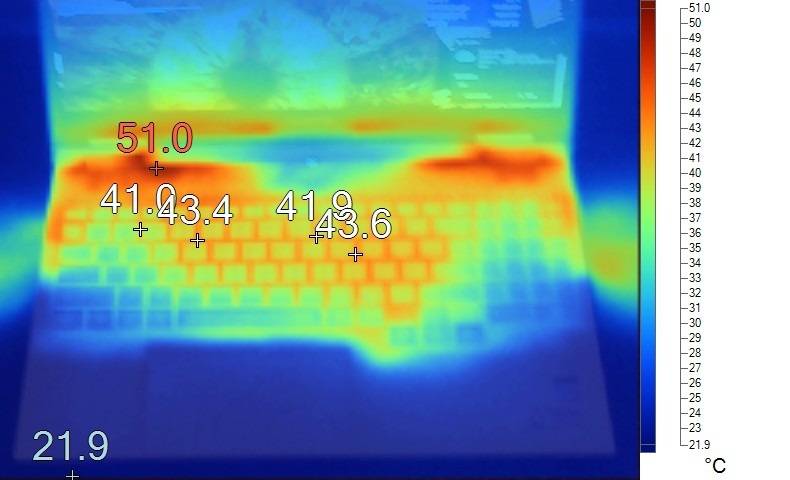 在环境温度大致23度的情况下,双烤30分钟后,表面温度最高处位于转轴出风口处,温度51度;键盘区域温度最高处位于中间偏右,温度43.6度。